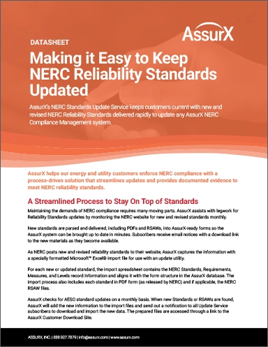 The NERC Standards Update Service keeps customers current with new and revised NERC Reliability Standards delivered rapidly to update any AssurX NERC Compliance Management system.